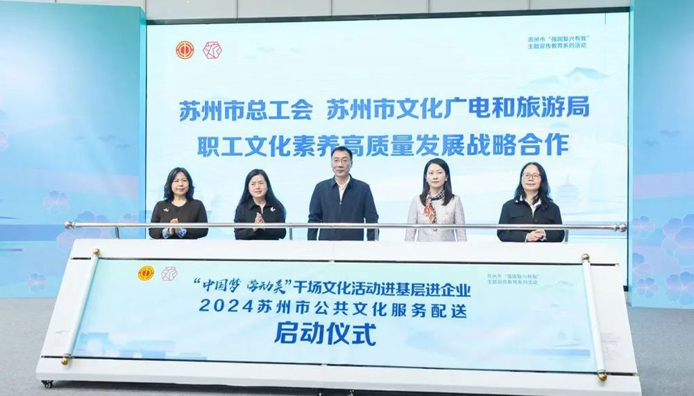 苏州市总工会和苏州市文化广电和旅游局达成职工文化素养高质量发展战略合作,通过组织共建、资源共享、人才共育、阵地共融等形式,立足新发展阶段,贯彻新发展理念,构建新发展格局,开展全方位、深层次、多领域全面战略合作关系,全面提高全市职工队伍综合素质,不断提升职工精神文化生活品质。同时,“中国梦 劳动美”千场文化活动进基层进企业和2024苏州市公共文化配送服务同步启动。