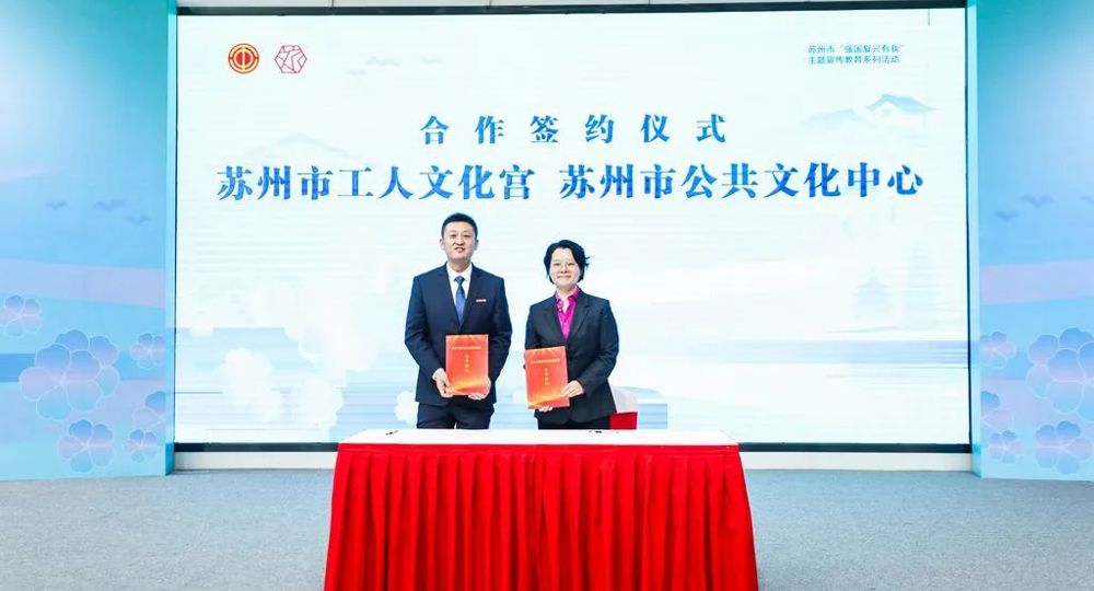 苏州市工人文化宫和苏州市公共文化中心进行签约,双方将在平台阵地共享、文艺人才互融、文艺成果联创等方面实现优势互补、合作共赢、资源共享,携手促进职工群众文化艺术活动结出累累硕果。